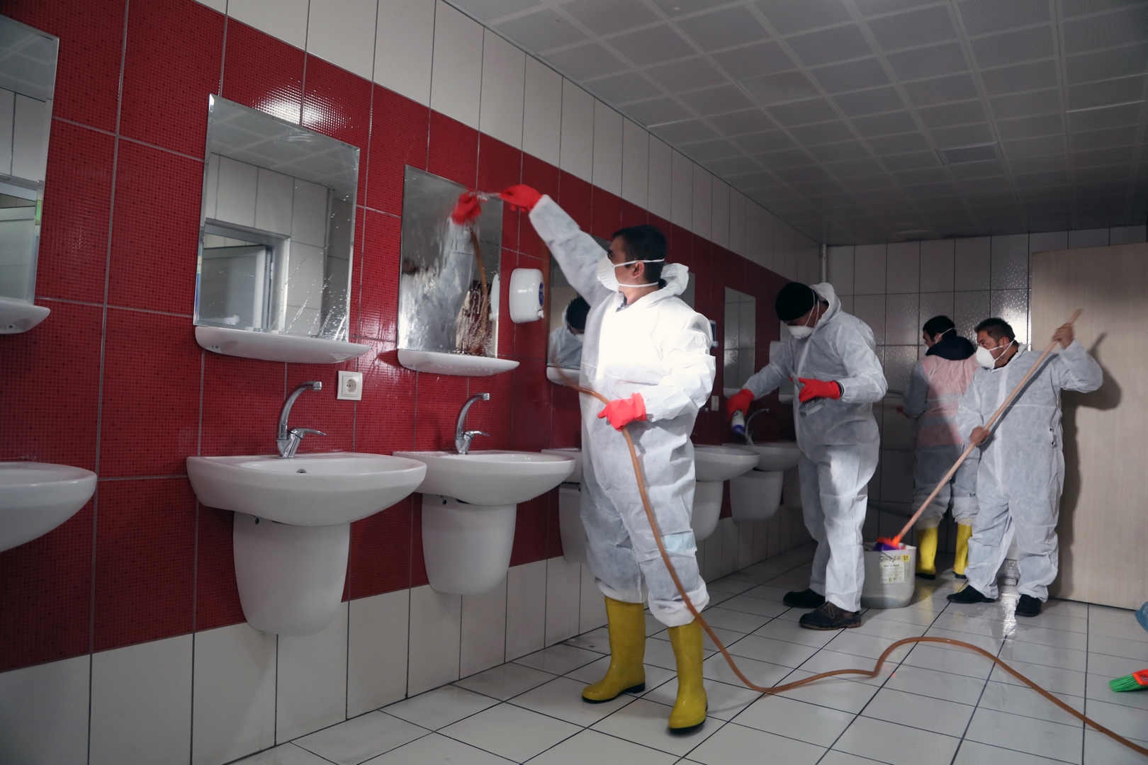 Belediye ekipleri okul tuvaletlerini temizleyerek ilaçlıyor