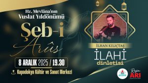 Nevşehir Belediyesi Kültür, Sanat ve Sosyal İşler Müdürlüğü’nün organize ettiği Hz. Mevlana’nın vuslat yıldönümü Şeb-i Arus İlahi Dinletisi 08 Aralık 2025 Pazartesi günü gerçekleştirilecek.