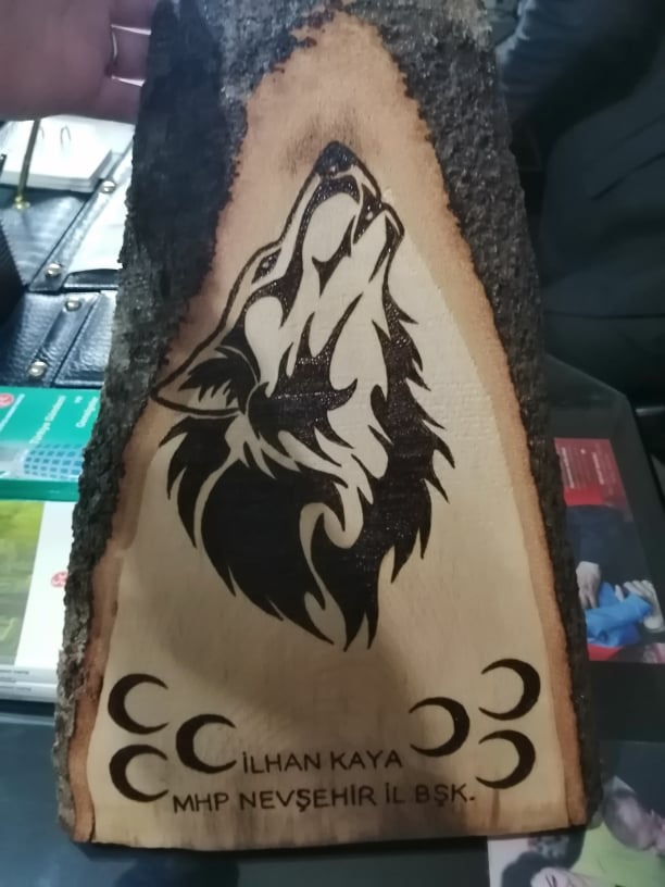 Nevşehir’de kara kalem, ahşap yakma sanatçısı Gülhan Kartal Milliyetçi Hareket Partisi İl Başkanı İlhan Kaya’ya üzerinde isminin ve Bozkurt ambleminin de yer aldığı bir ahşap yakma eseri hediye etti.