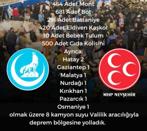 İçerisinde mont, bot, battaniye, kaşkol, bebek tulumu ve gıda kolisiyle birlikte 8 kamyon içme suyunun bulunduğu yardımın Nevşehir Valiliğinin organizasyonuyla birlikte deprem bölgesine gönderildiği belirtildi.