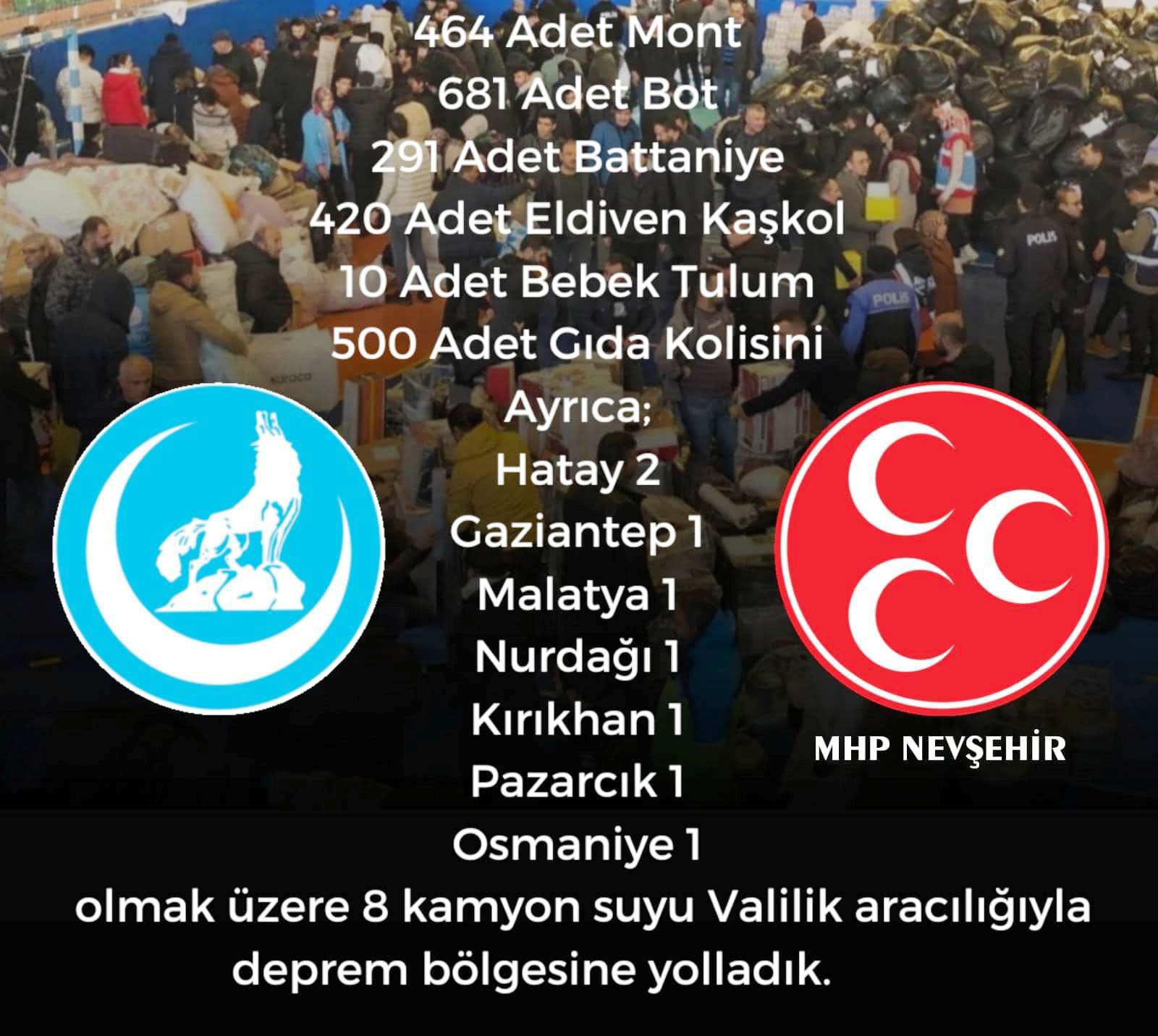 Milliyetçi Hareket Partisi Nevşehir İl Başkanlığı ve Ülkü Ocakları Başkanlığınca deprem bölgesine yardımda bulunuldu.