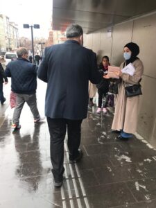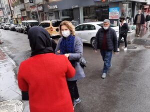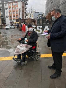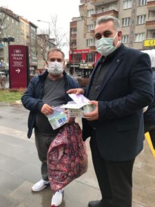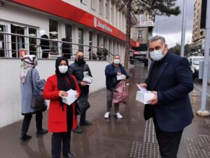 İl Başkanı İlhan Kaya, İl Başkan Vekili Yahya Leblebici, il yönetim kurulu üyeleri ve kadın kolları yöneticileri Ziraat Bankası önünden itibaren vatandaşlara salgınla mücadelenin en önemli unsurlarından biri olan maske dağıtımında bulundular.