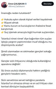 AK Parti Nevşehir Milletvekili Emre Çalışkan, İstanbul Büyükşehir Belediye Başkanı Ekrem İmamoğlu hakkında yürütülen yargı süreciyle ilgili çarpıcı açıklamalarda bulundu. Çalışkan, İmamoğlu’nun hukuka aykırı olarak kişisel verileri kaydetmek, rüşvet almak, kamu kurum ve kuruluşlarının ihalelerine fesat karıştırmak ve suç işlemek amacıyla örgüt kurmak suçlarından dolayı yargılandığını söyledi.