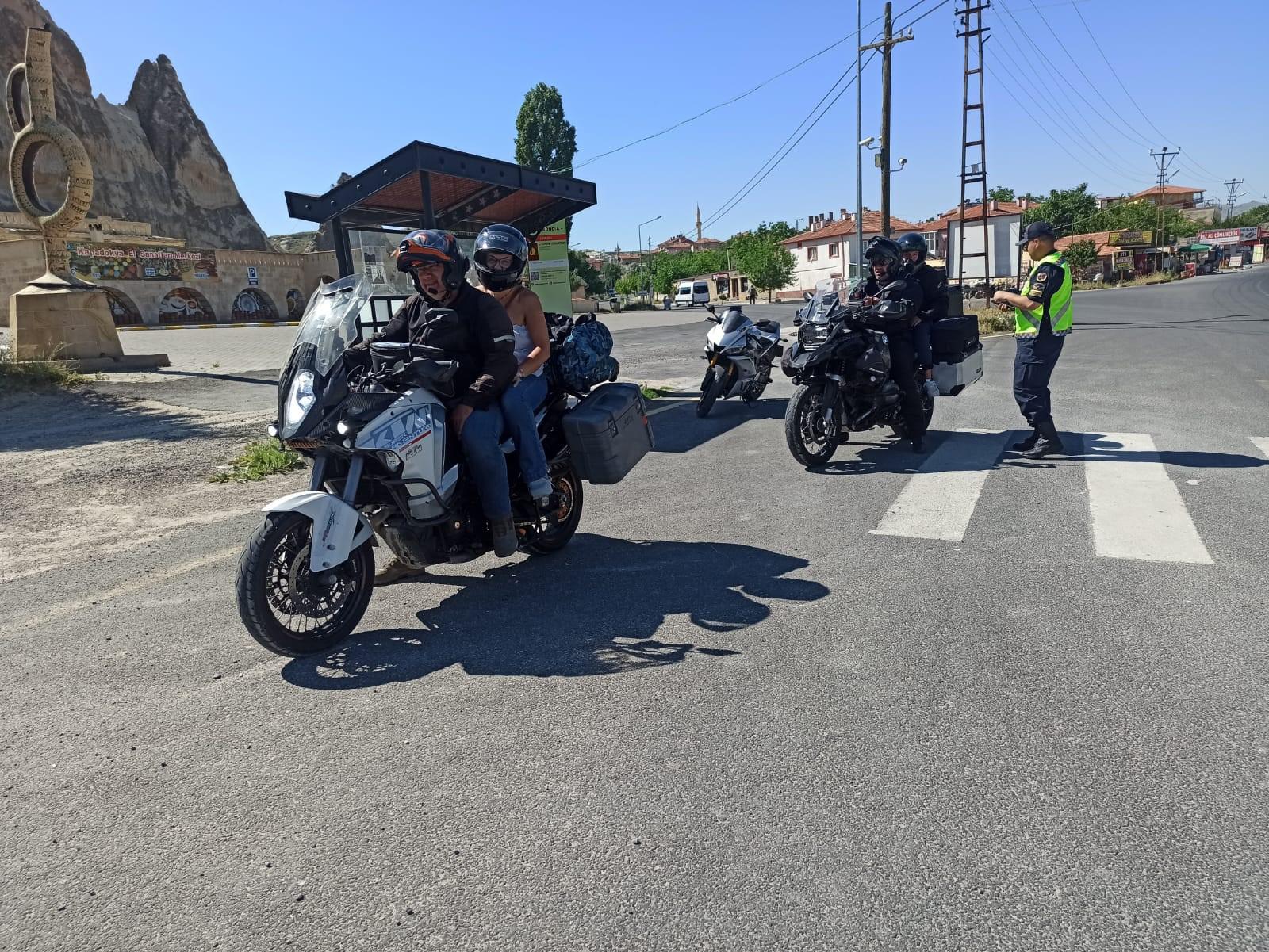 Nevşehir İl Jandarma Komutanlığı tarafından motosiklet sürücülerine yönelik bilgilendirme yapıldı. Motosiklet sürücülerine yönelik 2918 sayılı Karayolları Trafik Kanunu kapsamında trafik uygulaması yapılarak, “reflektif yelek giy, görünür ol” mottosuyla motosiklet sürücülerine trafikte görünür olma, koruyucu kıyafet kullanımı ve kask takmanın önemi anlatılarak, güvenli seyahat etme konularında bilgilendirme yapıldı.