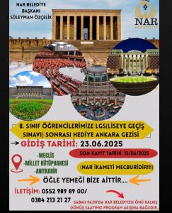 Gezi, 23 Haziran sabahı saat 06.00’da Nar Belediye binası önünden hareket edecek olan servislerle başlayacak. Program kapsamında öğrenciler, TBMM’yi, Millet Kütüphanesi’ni ve Anıtkabir’i ziyaret edecekler.