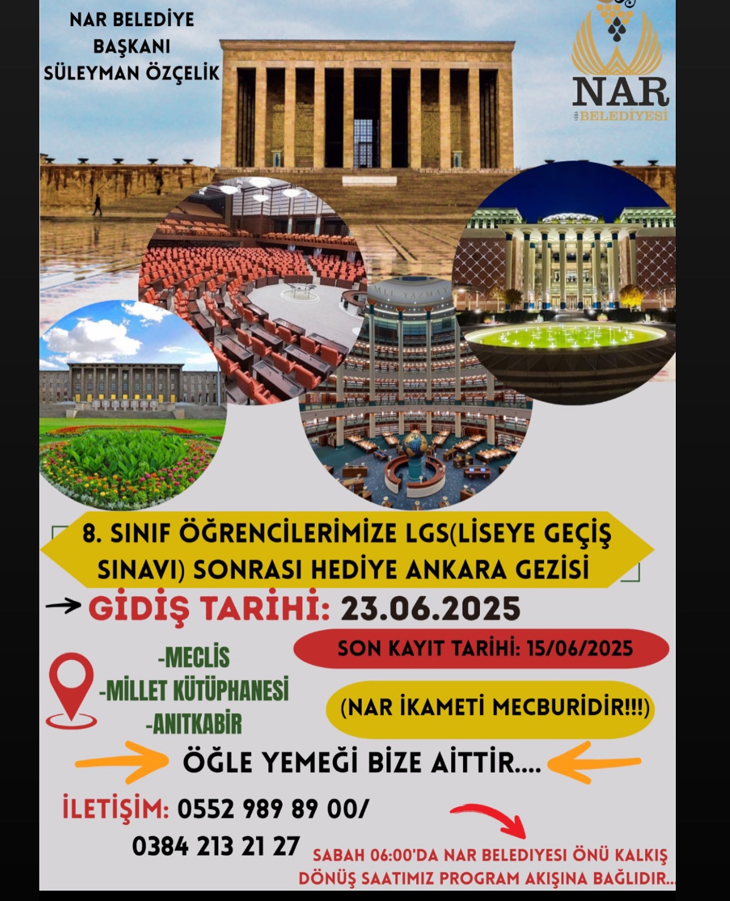 Belediye Başkanı Süleyman Özçelik, sosyal medya hesabından yaptığı duyuruda, Nar Belediyesi sınırları içinde ikamet eden öğrencilere Ankara turu hediye edeceklerini belirtti.