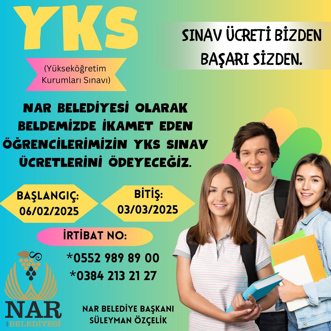 Belediye Başkanı Süleyman Özçelik, sosyal medya hesabından yaptığı paylaşımda “Sınav Ücreti Bizden, Başarı Sizden!” sloganıyla Yükseköğretim Kurumları Sınavı (YKS) giriş ücretlerinin Nar Belediyesi tarafından karşılanacağını duyurdu.