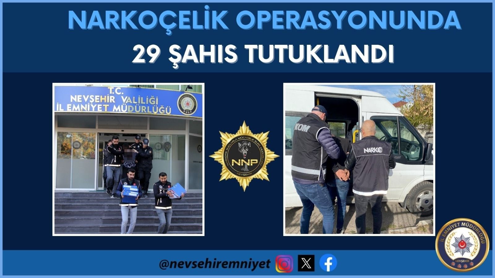 Nevşehir Cumhuriyet Başsavcılığı ve Narkotik Suçlarla Mücadele Şube Müdürlüğü ekiplerince 4 aydır yülütülen projeli çalışmalar neticesinde 29 kişi tutuklandı. 17.04.2024 günü 240 personel, 1 Helikopter, 2 İHA, 1 TEM Şube Operasyon timi, 4 dedektör köpek ile eş zamanlı olarak gerçekleştirilen Narkoçelik Operasyonunda 57 şahıs yakalanarak gözaltına alınmıştı.