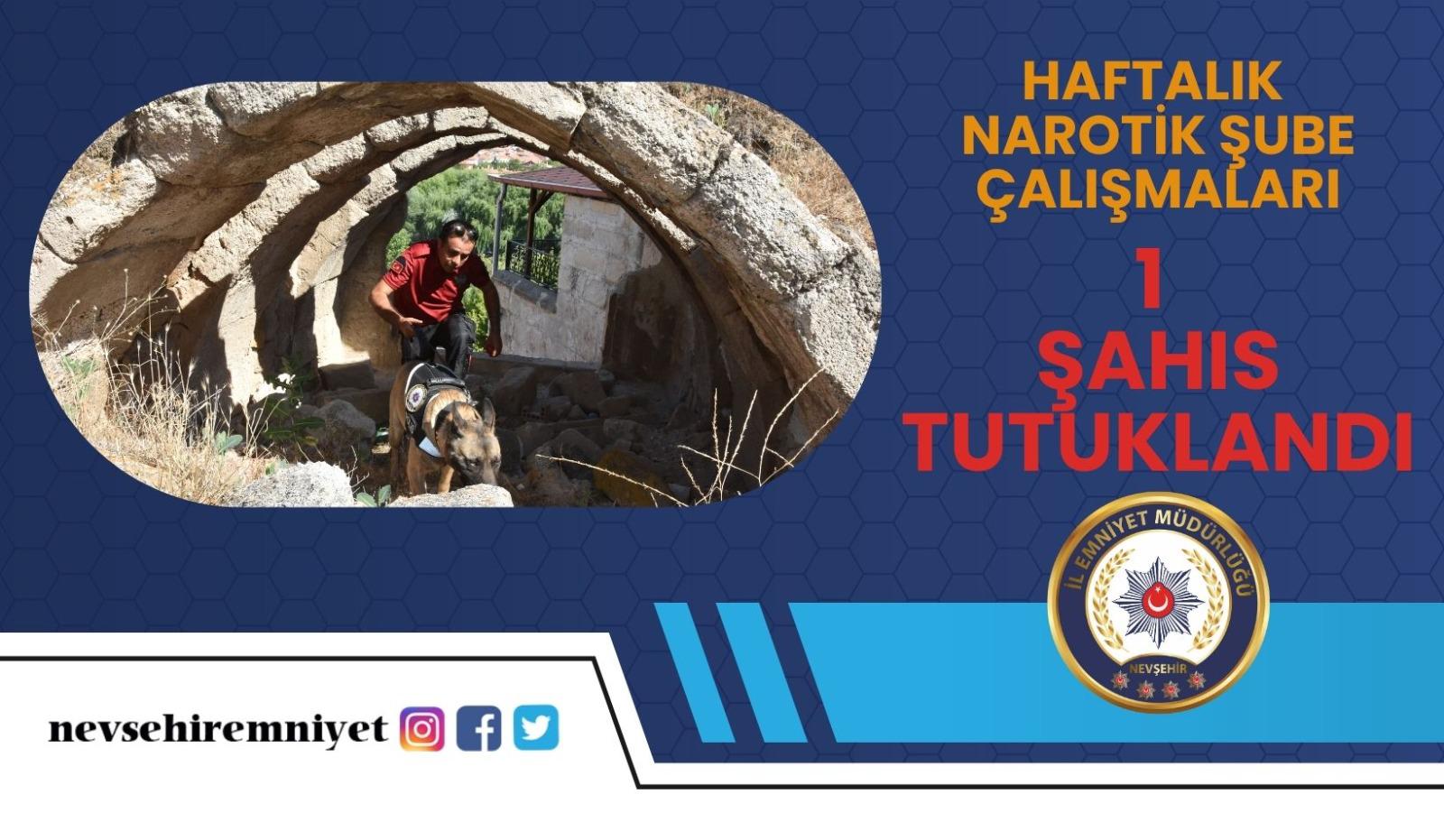 Nevşehir İl Emniyet Müdürlüğü ekiplerince Nevşehir Cumhuriyet Başsavcılığı koordinesinde ilimizde uyuşturucuya yönelik son bir hafta içerisinde yapılan çalışmalarda 8 farklı olay için çalışma yürütüldü. “Uyuşturucu Madde Bulundurmak ve Kullanmak” ve “Uyuşturucu veya Uyarıcı Madde İmal ve Ticareti” suçlarından 8 olayda yapılan çalışmalar neticesinde 26,93 gr. metamfetamin, 2,37 gr. kubar esrar, 5,90 gr. macun esrar, 0,21 gr. bonzai, 74 adet sentetik ecza ele geçirilmiş 16 şahsa işlem yapılmış, 1 şahıs tutuklandı.