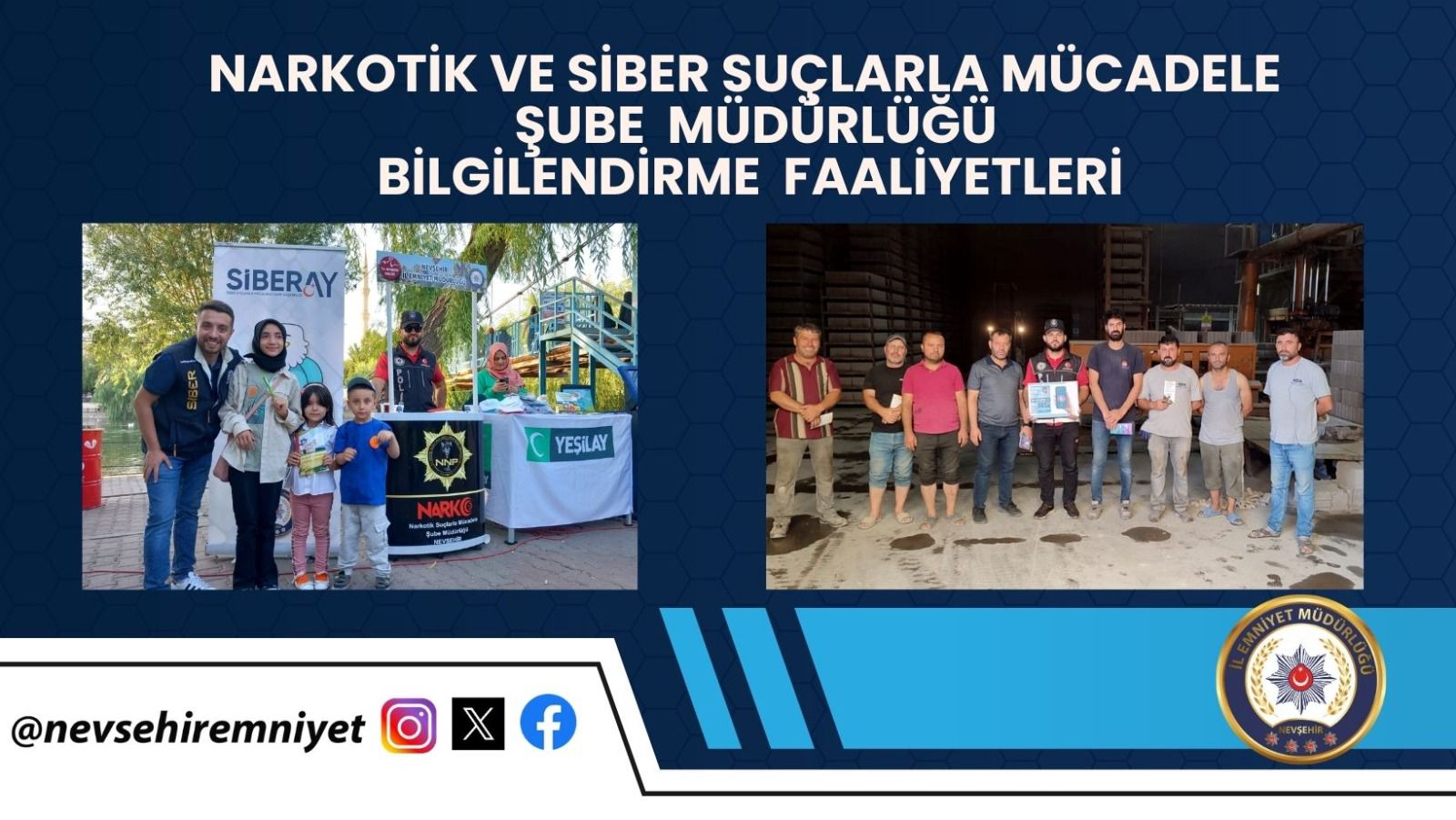 Narkotik Suçlarla Mücadele Şube Müdürlüğü ve Siber Suçlarla Mücadele Şube Müdürlüğü tarafından bilgilendirme faaliyetleri çerçevesinde fabrika işçilerine ve Avanos ilçemizi ziyaret eden vatandaşlarımıza yönelik UYUMA Projesi, Narko Nokta, Narko Rehber, Foto Blok, Metamfetamin Modülü, En İyi Narkotik Polisi Anne ve Önleyici Faaliyetlerimiz hakkında toplamda 6019 kişiye bilgilendirme yapıldı.