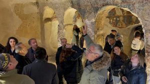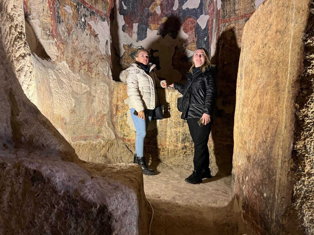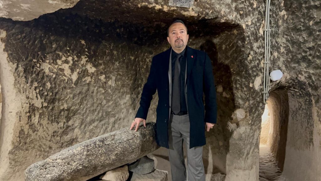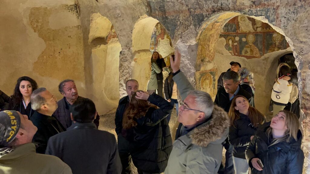 Daha sonra Kültür ve Turizm Bakanlığı tarafından turistlerin ziyaretine açık bulundurulan 2 katkı yeraltı yerleşimini gezen rehberler, Kapadokya bölgesinin ilk ve tek yeraltı tuvaleti, bazalttan yapılı dev sürgü taşı ve yeraltı şehrinde düşmanları tuzağa düşürmek için açılan dev kuyu alanlarını görme imkanı buldular.