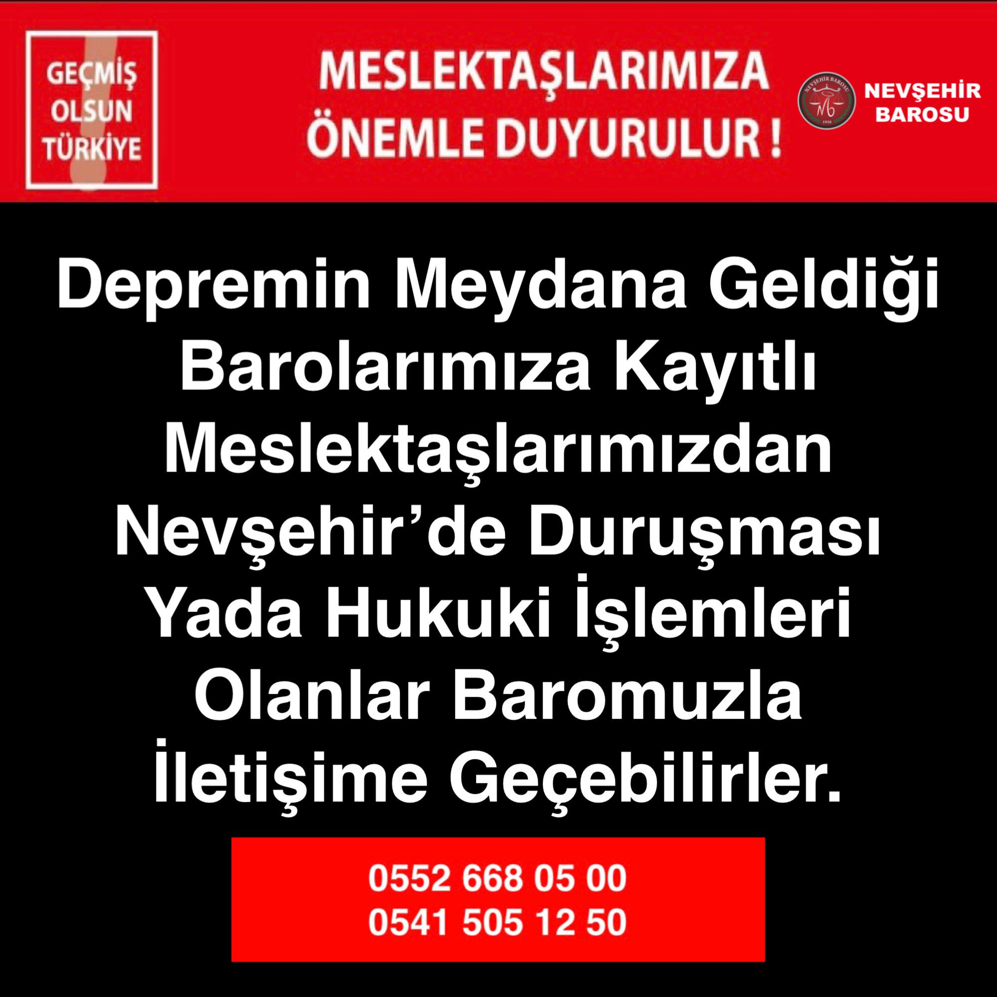 Açıklamada; “Depremin meydana geldiği illerde barolarımıza kayıtlı meslektaşlarımızdan Nevşehir de duruşması veya hukuki işlemleri bulunanlar baromuzla irtibata geçebilirler” denildi.