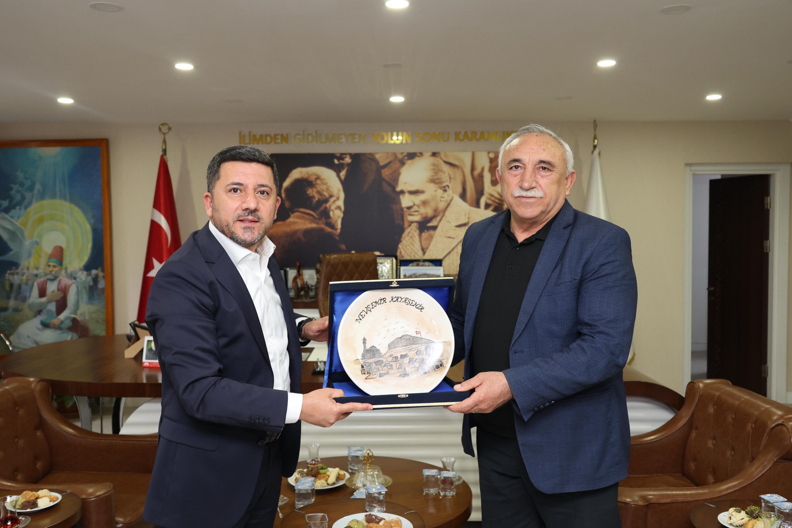 Hacıbektaş ziyareti kapsamında Kaymakam Abdülkadir Nar ile Kaymakamlık makamında bir araya gelen Nevşehir Belediye Başkanı Rasim Arı Kaymakam Nar’la bir süre sohbet ederek plaket takdim etti. Daha sonra Hacıbektaş Belediye Başkanı Ali Kaim ve Belediye Meclis üyeleri ile bir araya gelerek karşılıklı yapılan çalışmalar ve yürütülen projeler hakkında bilgiler alan Başkan Arı, Başkan Kaim’e Nevşehir Belediyesi Kültür ve Sosyal İşler Müdürlüğü’ne bağlı KAÇEM El Sanatları Öğretmenleri tarafından üretilen Kayaşehir Logolu tabak hediye etti.