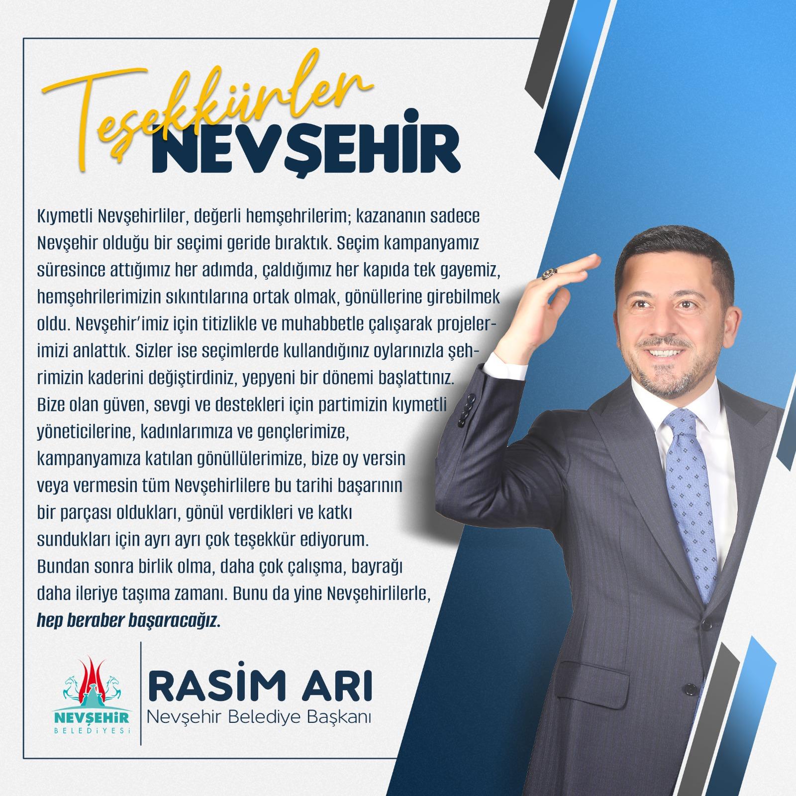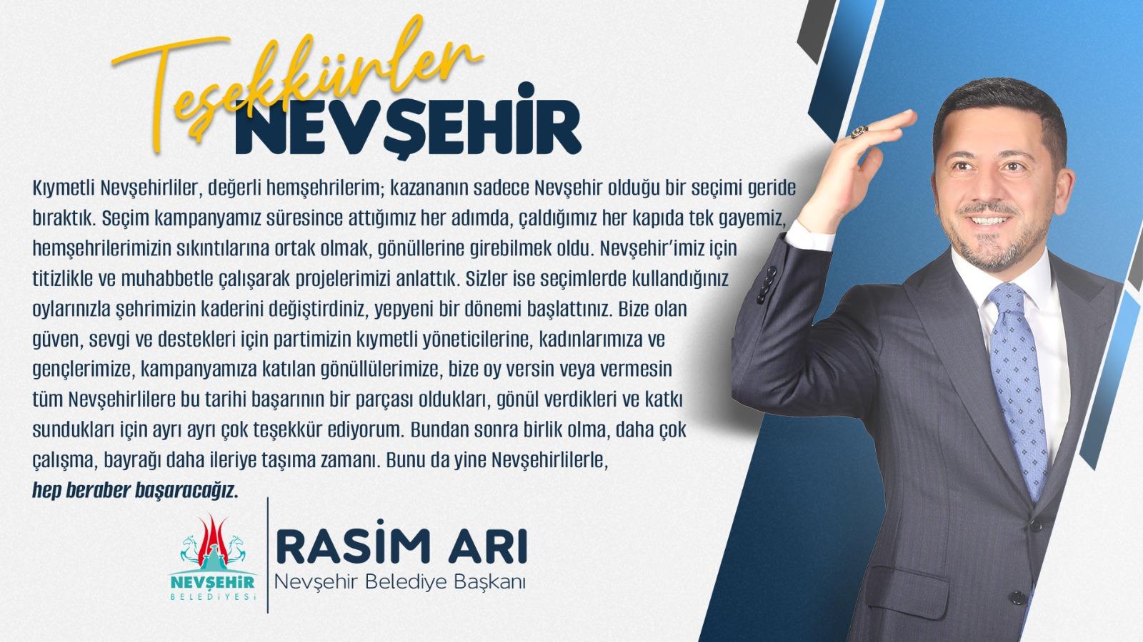 Nevşehir Belediye Başkanı seçilen Rasim Arı, 31 Mart Mahalli İdareler Yerel Seçimleri sonrası teşekkür mesajı yayımladı.