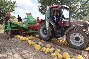 Burada kullandığı traktör ile kabak tarlasında hasat yapan Başkan Arı daha sonra Altay Grup tesislerini gezerek çerezlik kabak çekirdeğinin işlenmesini inceledi.
