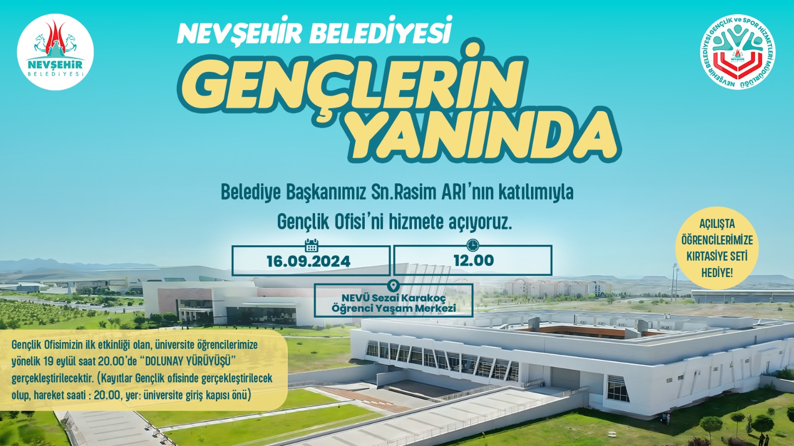 Nevşehir Belediyesi tarafından Nevşehir Hacı Bektaş Veli Üniversitesi Kampüsü içerisinde oluşturulan Nevşehir Belediyesi Gençlik Ofisi, 16 Eylül 2024 Pazartesi günü açılacak.