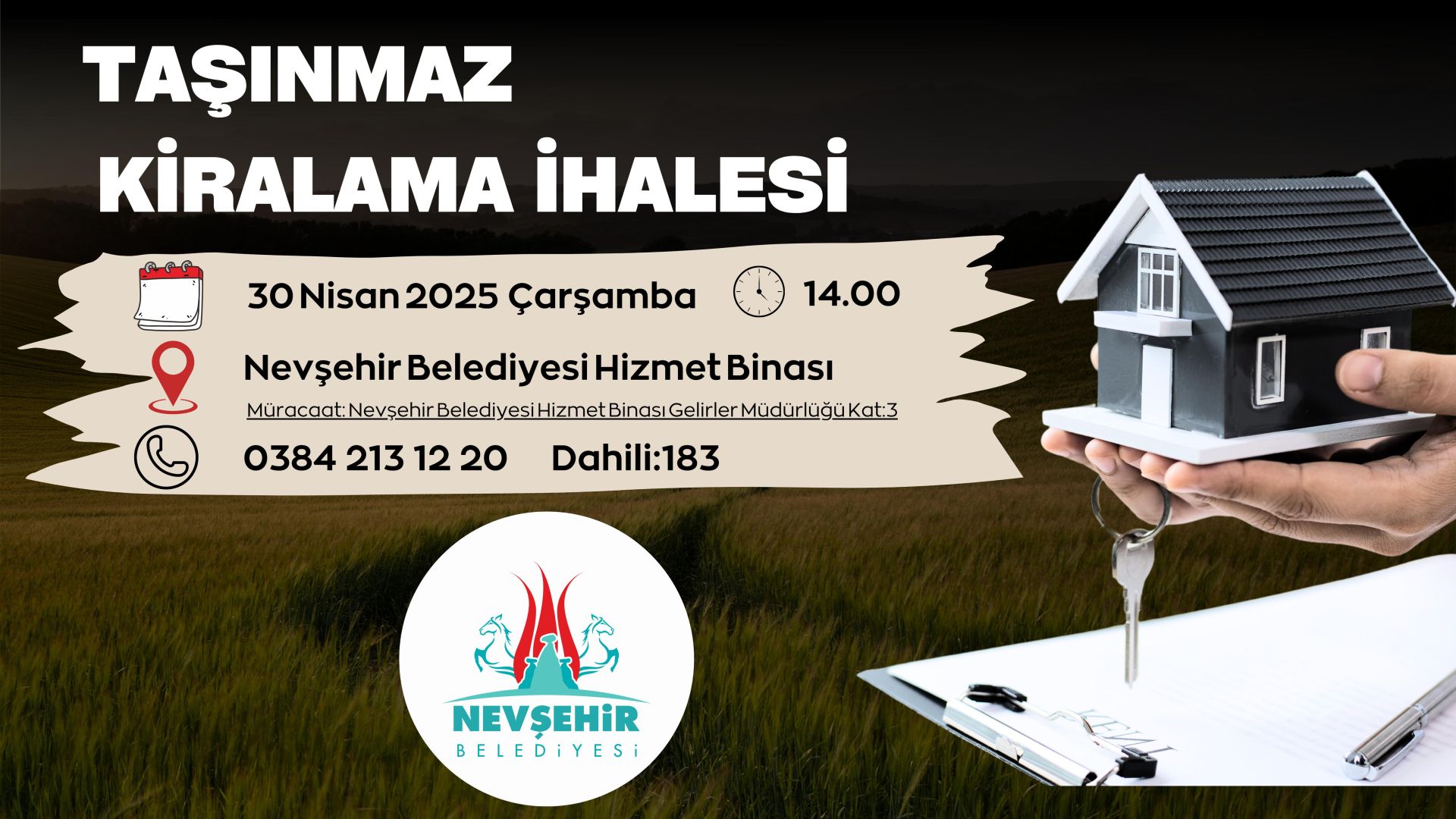 Nevşehir Belediyesi, çeşitli mahallelerde bulunan 14 taşınmazın 3 yıl, 1 taşınmazın 6 ay ve 1 taşınmazın 10 yıl süre ile kiralanması için 30 Nisan 2025 Cuma günü ihale yapacak.