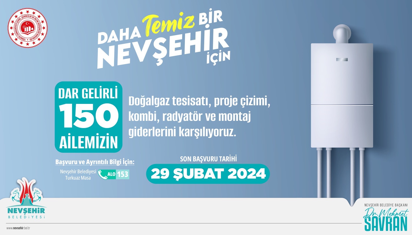 Nevşehir Belediyesi, evsel ısınmada kömür kullanımının azaltılması suretiyle hava kalitesinin iyileştirilmesi ve dar gelirli aileleri doğalgaz kullanımına teşvik etmek için doğalgaz tesisat kurulumu ve kombi desteği sağlayacak. Proje ile birlikte 150 ailenin konutlarındaki tüm tesisat ve kombi giderleri Nevşehir Belediyesi tarafından karşılanacak.