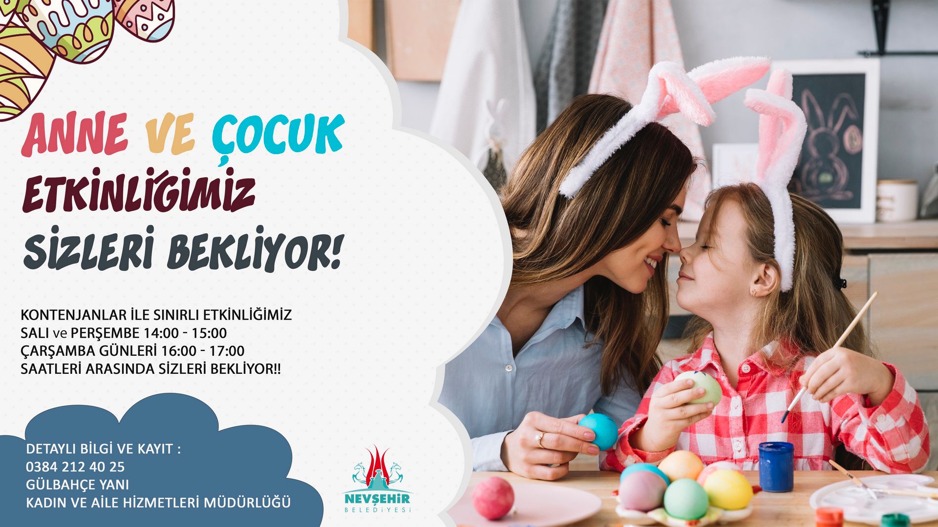Sınırlı kontenjanla gerçekleştirilen etkinliklere çocukları ile birlikte katılmak isteyen anneler 0384 212 40 25 nolu Nevşehir Belediyesi Kadın ve Aile Hizmetleri Müdürlüğü iletişim hattından kayıt yaptırabiliyor.