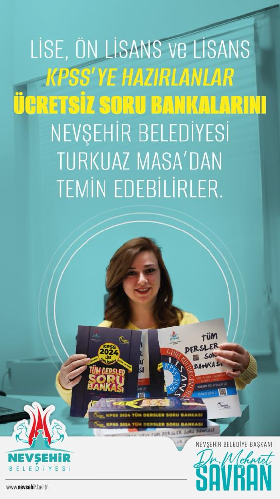 Lise, Ön Lisans ve Lisans düzeylerinde sınava girecek olan adaylar soru bankalarını hafta içi 08.00-17.00 saatleri arasında Nevşehir Belediyesi Başkanlık Binası girişinde bulunan Turkuaz Masa’ya başvurarak ücretsiz olarak alabilecek.