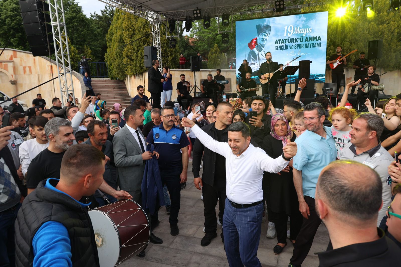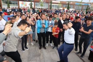 Belediye Başkanı Arı, Taş’ın seslendirdiği oyun havalarına gençlerle birlikte eşlik ederek sahnede oynadı.