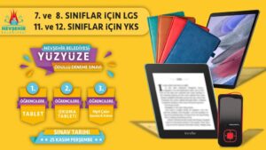 Alanında uzman eğitimciler tarafından yeni nesil sorulardan hazırlanan deneme sınavı sonunda Nevşehir Belediyesi Kültür ve Sosyal İşler Müdürlüğü tarafından LGS ve YKS’de birinci olan öğrencilere tablet, 2. olan öğrencilere okuma tableti ve 3. Olan öğrencilere ise MP4 Çalar, kalem seti ve ajanda hediye edilecek.