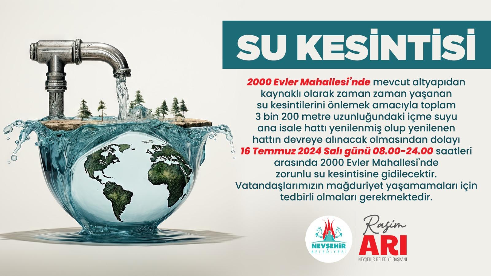 Konuyla ilgili Nevşehir Belediyesi Su ve Kanalizasyon Müdürlüğü’nden yapılan açıklamada, “2000 Evler Mahallesi’nde mevcut altyapıdan kaynaklı olarak zaman zaman yaşanan su kesintilerini önlemek amacıyla toplam 3 bin 200 metre uzunluğundaki içme suyu ana isale hattı yenilenmiş olup yenilenen hattın devreye alınacak olmasından dolayı 16 Temmuz 2024 Salı günü 08.00 – 24.00 saatleri arasında 2000 Evler Mahallesi’nde zorunlu su kesintisine gidilecektir. Vatandaşlarımızın mağduriyet yaşamamaları için tedbirli olmaları gerekmektedir.” denildi.