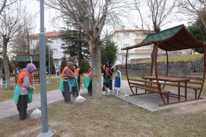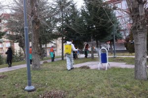 Düzenli olarak parklarda temizlik çalışması yapan belediye ekipleri ayrıca park içerisindeki kent mobilyaları, çöp kovaları, spor kondisyon aletleri ve çocuk oyun gruplarını ilaçlayarak dezenfekte ediyor.