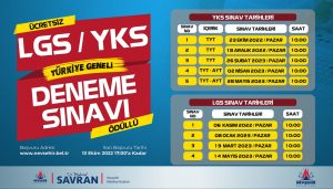 Deneme sınavlarının ilki 23 Ekim 2022 Pazar günü YKS sınavlarına hazırlanan öğrenciler için yapılacak. TYT Deneme Sınavı’na katılmak isteyen öğrenciler 13 Ekim 2022 Perşembe günü saat 17.00’a kadar Nevşehir Belediyesi’nin kurumsal web sitesi olan www.nevsehir.bel.tr adresinden kayıtlarını yaptırabilecek.