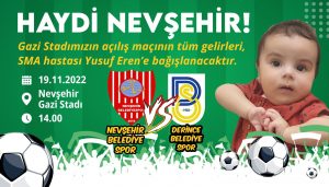 Nevşehir Belediyespor Kulüp Yönetimi, hafta sonu Gazi Stadı’nda oynanacak olan Nevşehir Belediyespor-Belediye Derincespor maçının tribün gelirlerinin SMA hastası Yusuf Eren’e bağışlanacağını açıkladı.