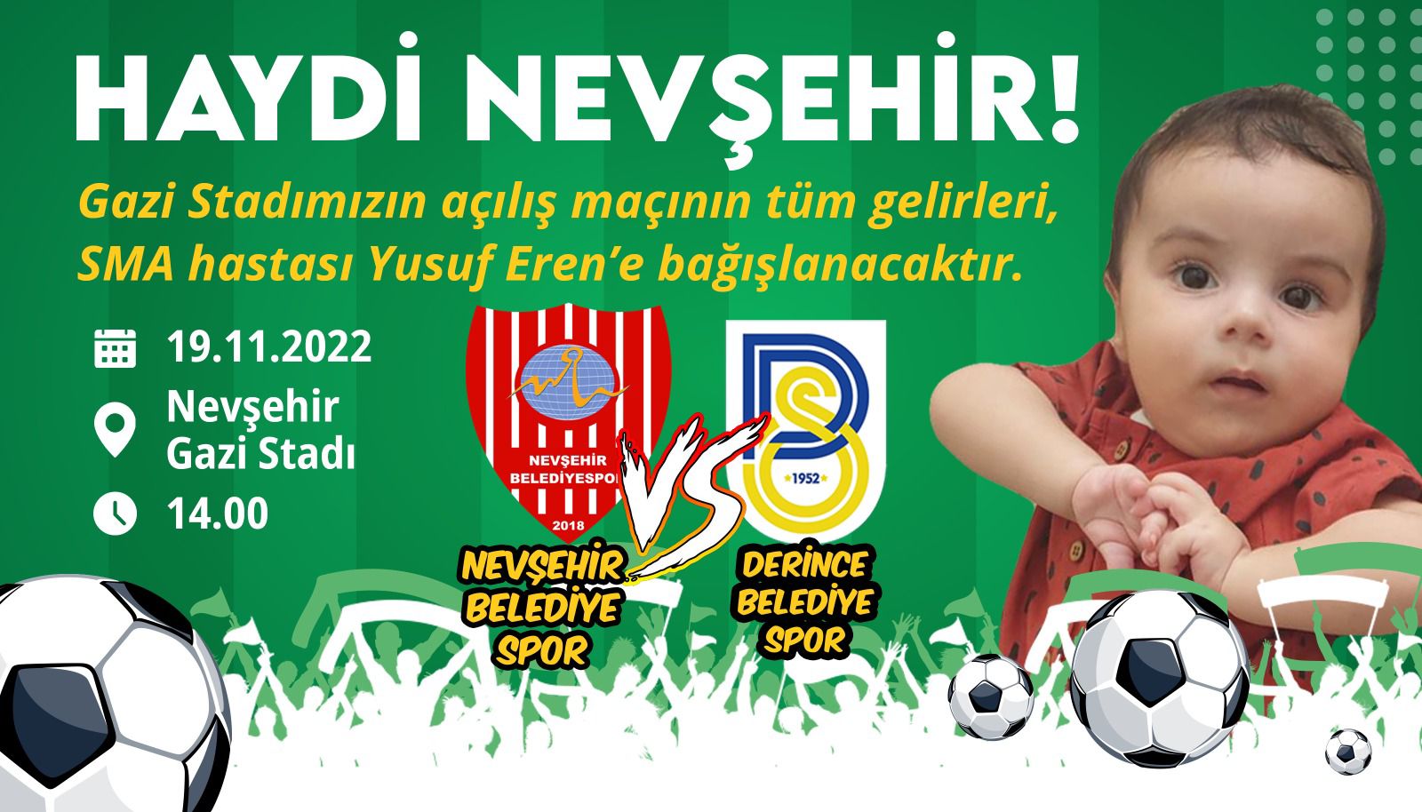 Gazi Stadı’nda saat 14.00’te başlayacak olan müsabaka öncesinde, Nevşehir Belediyespor Kulübü tarafından yapılan açıklamada, müsabakanın tüm bilet gelirlerinin Nevşehirli SMA hastası Yusuf Eren’e bağışlanacağını açıkladı. Tüm taraftarlarını cumartesi günü Gazi Stadı’na davet eden kırmızı beyazlı yönetim, müsabaka öncesinde kapalı tribün için biletlerin 30 TL , açık tribün için ise 20 TL’den satılacağını duyurdu.