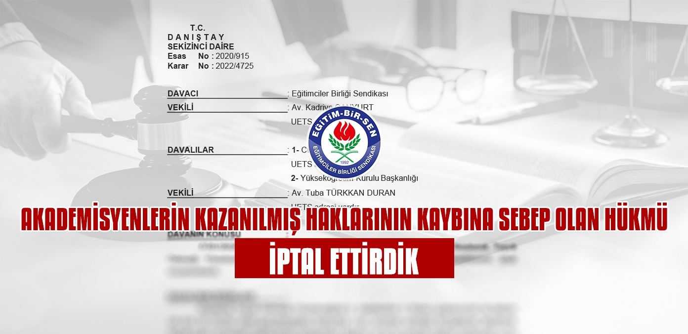 Eğitim-Bir-Sen Nevşehir Şube Başkanlığı akademisyenlerin kazanılmış haklarının kaybına sebep olan hükmü iptal ettirdi.