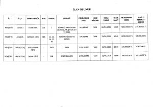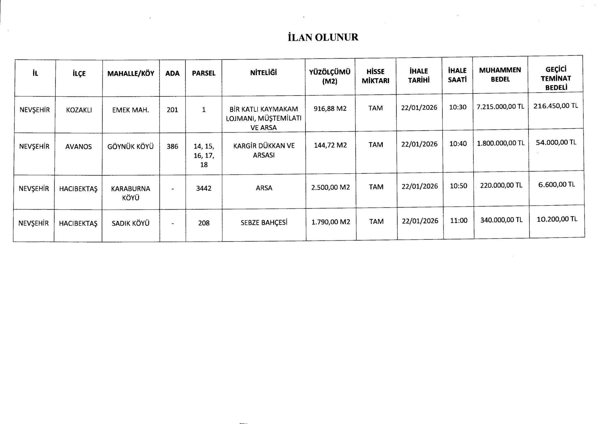 İhale, tabloda belirtilen tarih ve saatlerde Nevşehir İl Özel İdaresi binasında, Zübeyde Hanım Caddesi No:65 adresinde bulunan İl Genel Meclisi Toplantı Salonu’nda yapılacak.