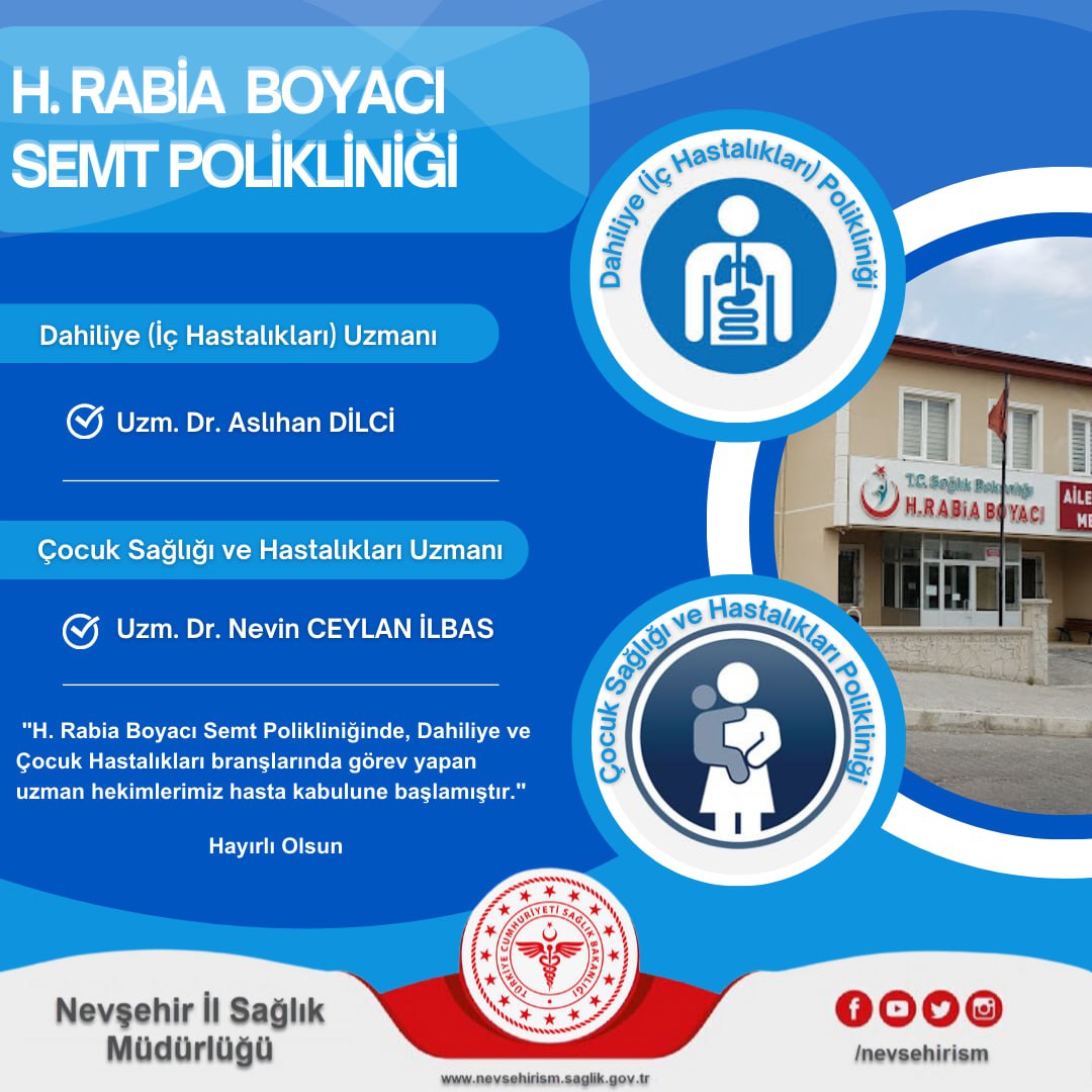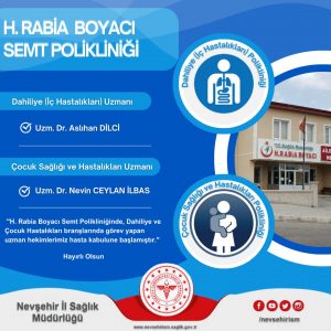 Nevşehir İl Sağlık Müdürlüğü, H. Rabia Boyacı Semt Polikliniği’nde Dahiliye ve Çocuk Hastalıkları branşlarında görev yapan uzman hekimlerin hasta kabulüne başladığını duyurdu. Vatandaşların polikliniğe başvurarak sağlık hizmetlerinden yararlanabileceği bildirildi.