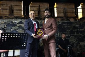 Savran, konuşmasının ardından tebrik ettiği genç sanatçıya gecenin anısına çini bir tabak hediye etti.