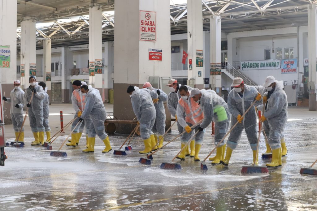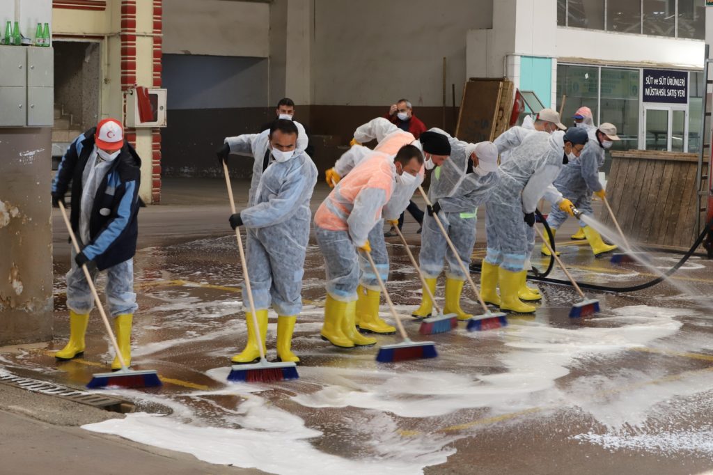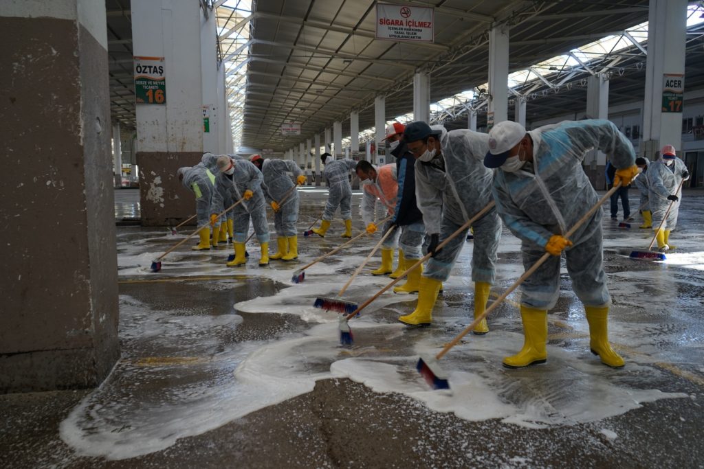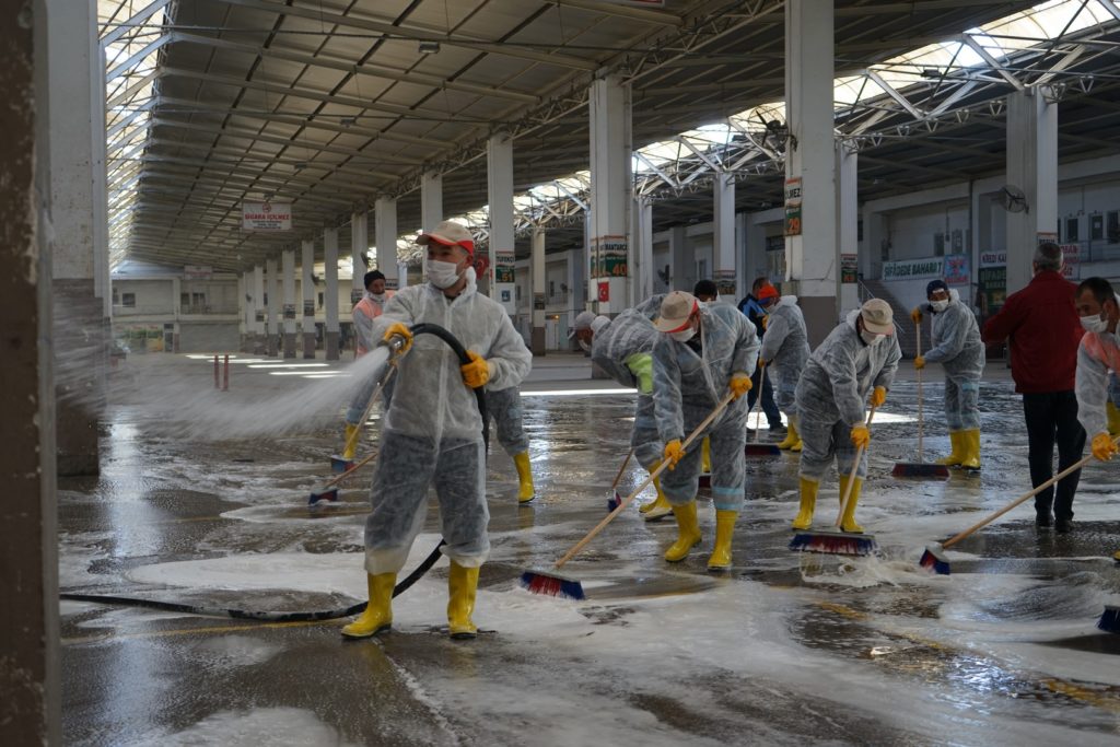 İlk olarak vakumlu süpürge araçları ve el süpürgeleri ile pazar alanını çöplerden arındıran belediye ekipleri, ardından tüm zemini sabunlu su ile yıkayarak temizledi.