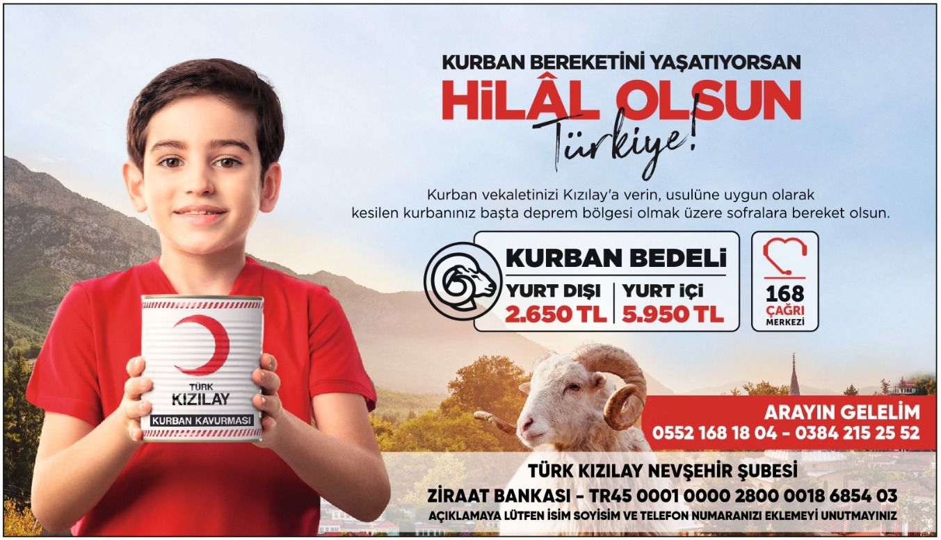 Kurban vekâletlerini Kızılay’a emanet ederek gerçek ihtiyaç sahibine ulaşmanın huzurunu yaşamak isteyen hayırseverler 0552 168 18 04 veya 0384 215 25 52 numaralı Nevşehir Türk Kızılay İletişim hattını arayabilir, Borsa Kavşağı üstü Vakıfbank karşısı 1.kat’ta bulunan Kızılay Şubesine gidip yapabilirler. Evinden çıkamayan, bağış yapmak isteyen lakin bu imkanlara ulaşım sıkıntısı olan bireylerin ise, Kızılay ekipleri evlerine gidip, makbuz karşılığı bağışlarını alacak!
