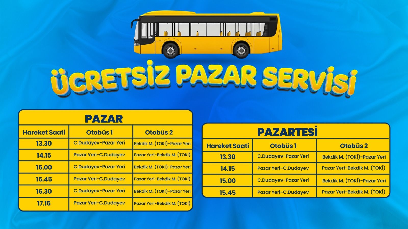 09 Şubat 2025 Pazar günü Uygulaması ile Bekdik Mahallesi TOKİ evleri ile Cevherdudayev Mahallesi’nden pazara ve pazardan bu 2 mahalleye belirlenen saatlerde ücretsiz Pazar servisi düzenlenecek.