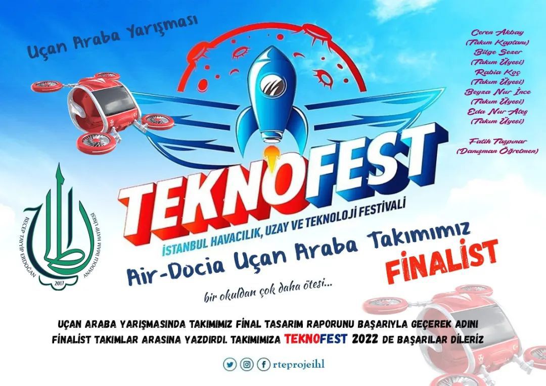 Türkiye’nin bilim ve mühendislik alanlarında yetişmiş insan kaynağını artırmayı hedefleyen TEKNOFEST, Havacılık Uzay ve Teknoloji Festivali kapsamında Nevşehir Recep Tayyip Erdoğan Proje Anadolu İmam Hatip Lisesi Teknoloji Kulübü 3 Takım 3 Proje ile TEKNOFEST 2022 Finalistleri arasına adını yazdırdı.