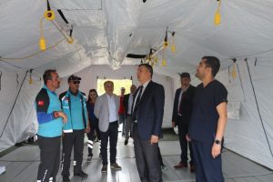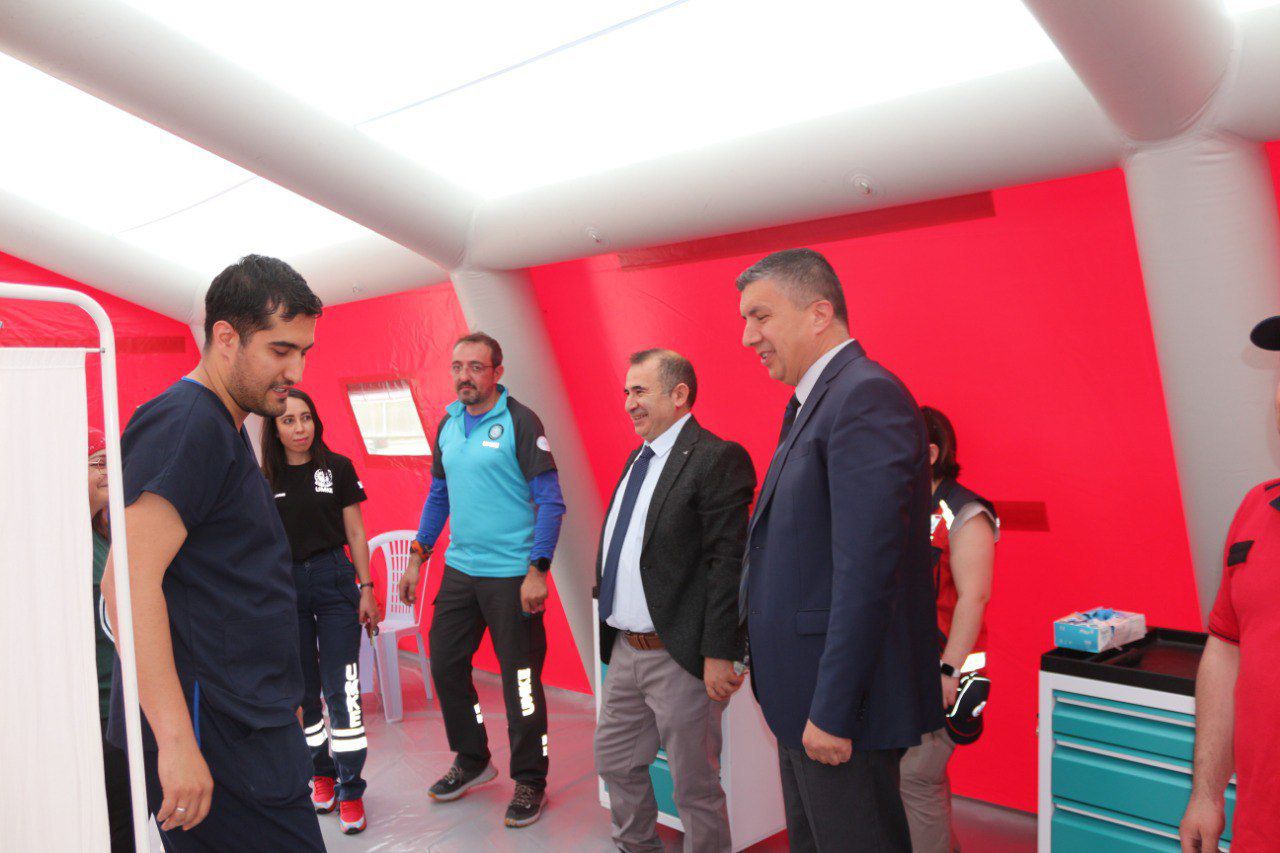 İl Sağlık Müdürü Op. Dr. Hasan Tartar tatbikat alanını gezerek bir acil müdahale çadırı, iki barınma çadırını ve mobil kurtarma aracını yerinde inceledi.
