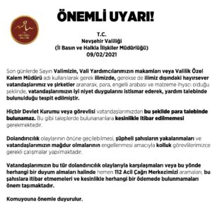 Nevşehir Valilinden yapılan yazılı açıklamada, “Son günlerde Valimizin, Vali Yardımcılarımızın makamları veya Valilik Özel Kalem Müdürü adı kullanılarak gerek ilimizde, gerekse de ilimiz dışındaki hayırsever vatandaşlarımız ve şirketler aranarak, para, engelli arabası ve malzeme ihyacı olduğu şeklinde, vatandaşlarımızın iyi niyet duygularını istismar ederek, yardım talebinde bulunulduğu tespit edilmiştir. Hiçbir Devlet Kurumu veya görevlisi vatandaşlarımızdan bu şekilde para talebinde bulunamaz. Bu gibi taleplerde bulunanlara kesinlikle itibar edilmemesi gerekmektedir. Dolandırıcılık olaylarının önüne geçilebilmesi, şüpheli şahısların yakalanmaları ve vatandaşlarımızın mağdur olmalarının engellenmesi amacıyla kolluk görevlilerimizce gerekli çalışmalar yapılmaktadır. Vatandaşlarımızın bu tür dolandırıcılık olaylarıyla karşılaşmaları veya bu yönde herhangi bir duyum almaları halinde hemen 112 Acil Çağrı Merkezini aramaları, bu şahıslara itibar etmemeleri ve kesinlikle herhangi bir ödemede bulunmamaları önem taşımaktadır” ifadelerine yer verildi.