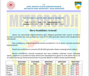 Nevşehir Valiliği, önümüzdeki günlerde bölgede etkili olması beklenen sıcak hava dalgasına karşı vatandaşları uyardı. Meteorolojik verilere göre, hava sıcaklıklarının mevsim normallerinin üzerine çıkarak 7 ila 12 derece artacağı belirtildi.