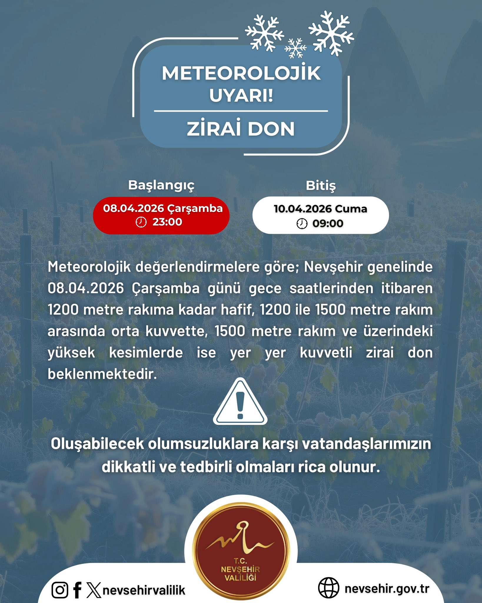 Nevşehir Valiliği, il genelinde beklenen zirai don riskine karşı vatandaşları uyardı. Yapılan meteorolojik değerlendirmelere göre, gece saatlerinden itibaren etkili olması beklenen soğuk hava nedeniyle özellikle tarımsal faaliyetlerin sürdüğü bölgelerde don olaylarının görülebileceği bildirildi.