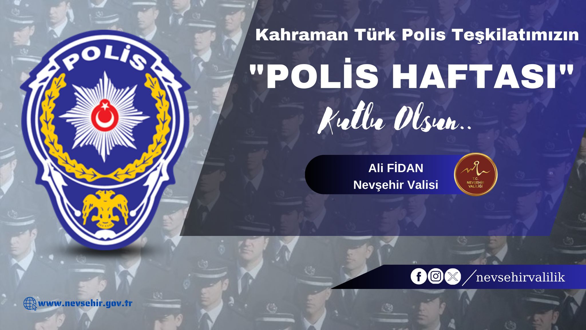 Nevşehir Valisi Ali Fidan açıklama yaparak Polis Haftasını kutladı. Vali Fidan mesajında “Aziz Milletimizin huzur, güven ve emniyet içerisindeyaşamasını temin etme, vatandaşlarımızın temel hak ve hürriyetlerini koruma, devletimizin bölünmez bütünlüğünü hedef alan her türlü tehlikeye karşı mücadele etme hususlarında büyük cesaret ve kahramanlıklar gösteren, ülkemizin her köşesinde büyük bir özveriyle görev yapan Türk Polis Teşkilatının kuruluşunun 179. Yıl dönümünü kutlamanın gururunu yaşıyoruz.