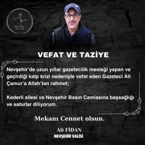 Nevşehir Valisi Ali Fidan kalp krizi geçirerek hayata veda eden gazeteci Ali Çamur’a başsağlığı diledi. Vali Fidan açıklamasında “Nevşehir’de uzun yıllar gazetecilik mesleği yapan ve geçirdiği kalp krizi nedeniyle vefat eden Gazeteci Ali Çamur’a Allah’tan rahmet; kederli ailesi ve Nevşehir basın camiasına başsağlığı ve sabırlar diliyoruz” dedi.