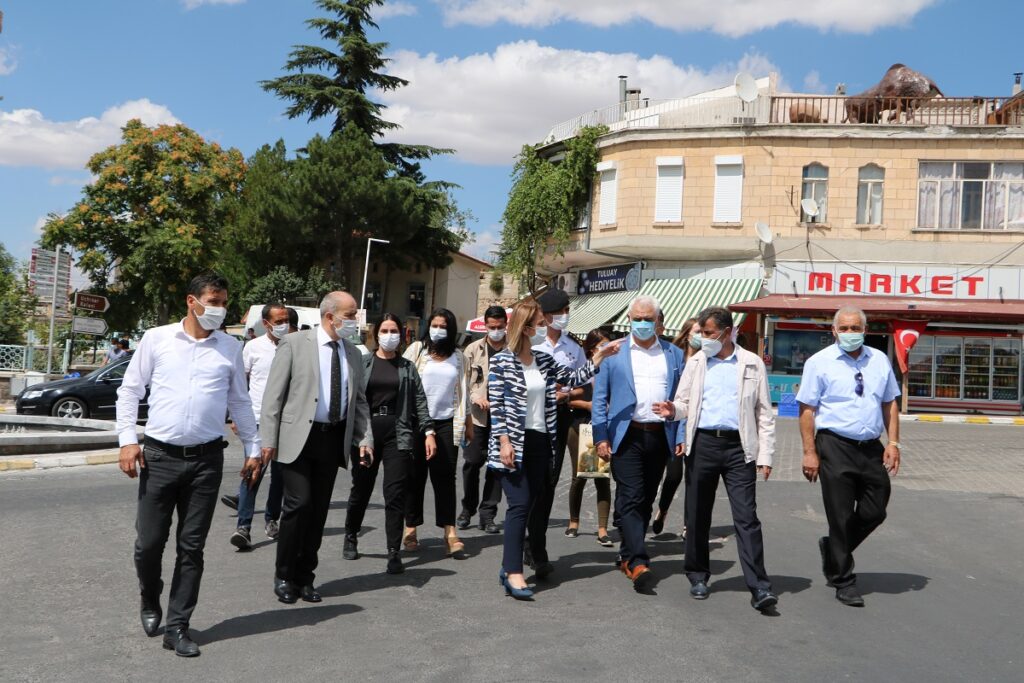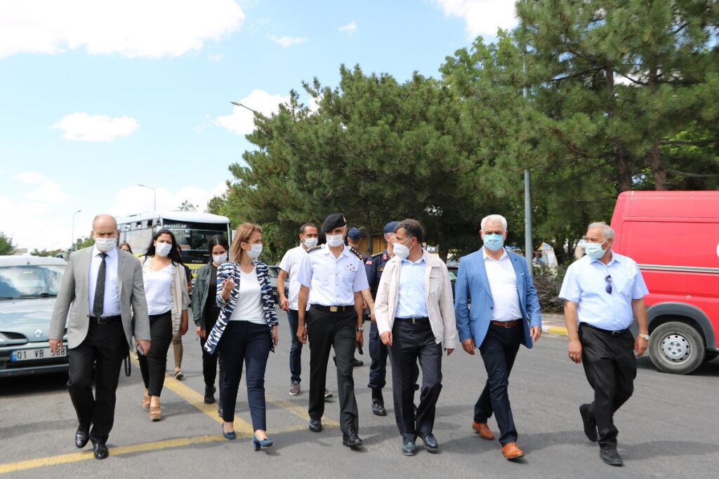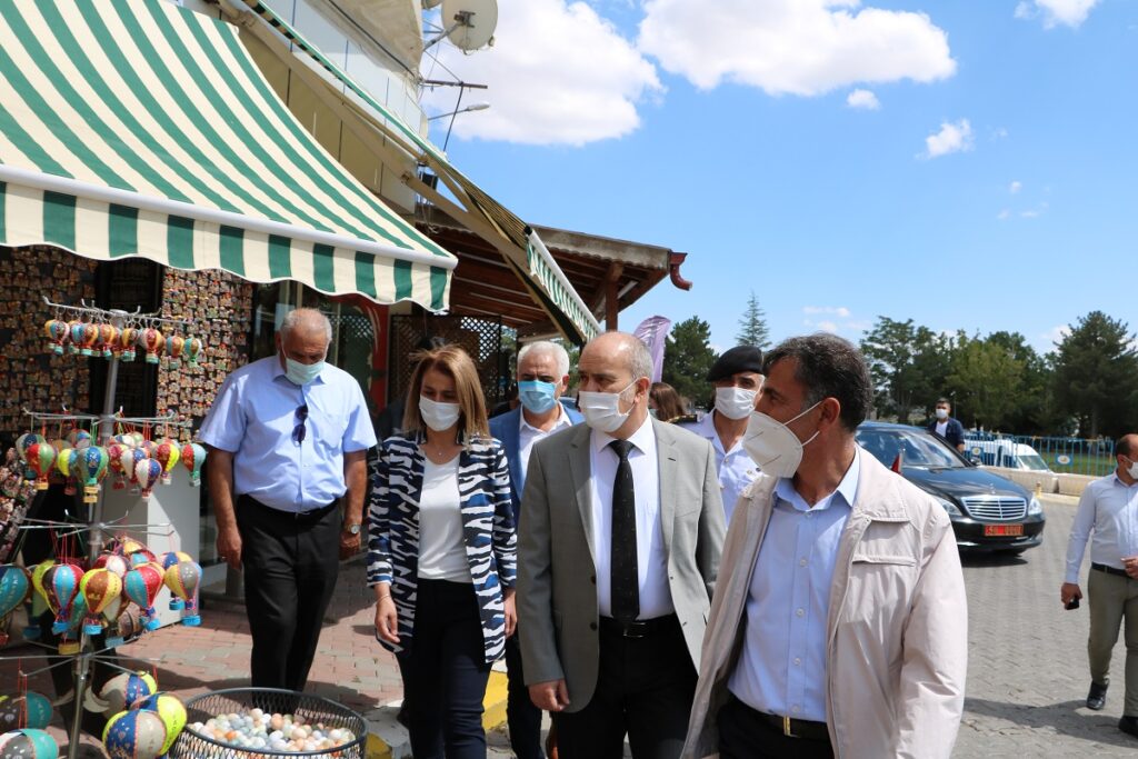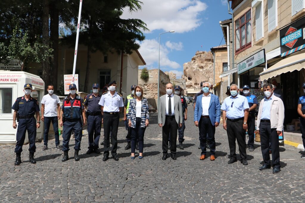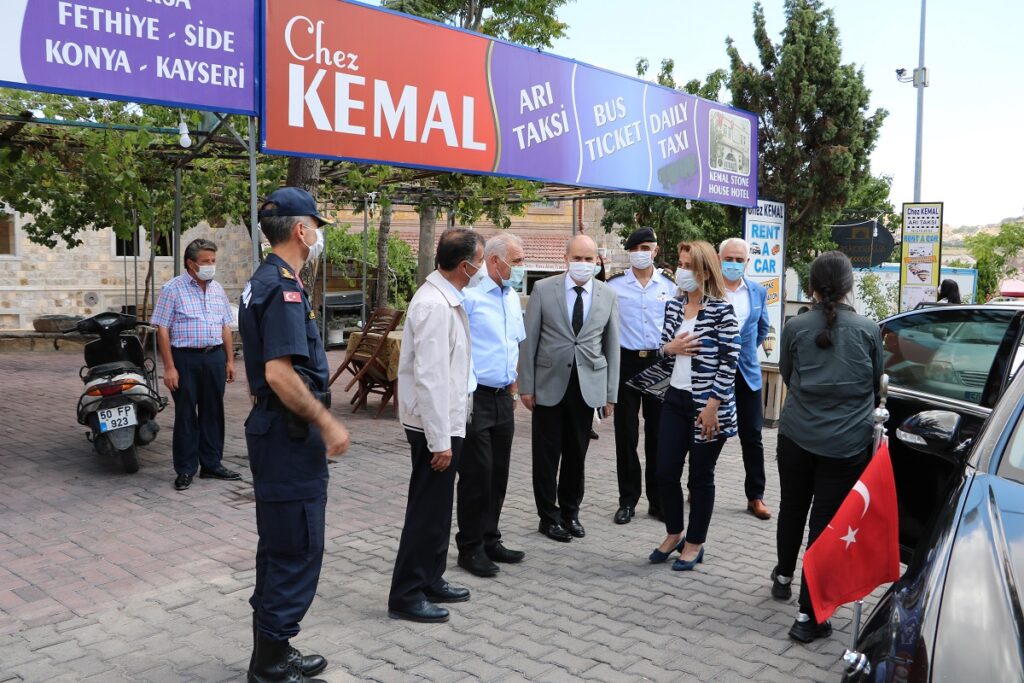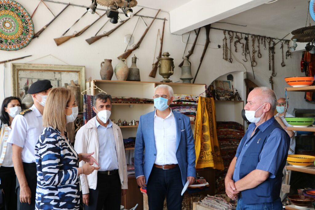 Nevşehir Valisi İnci Becel Sezer 81 İle gönderilen genelge kapsamında merkeze bağlı Uçhisar Kasabasında esnafları denetimlerde bulunarak maske hediye etti.