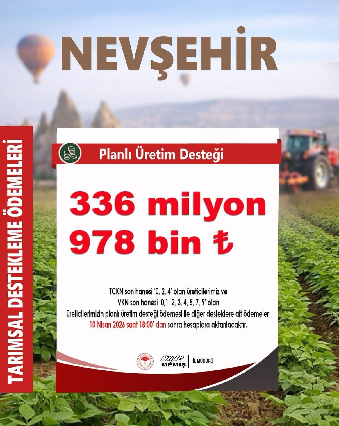 Ödemeler kapsamında, T.C. kimlik numarasının sonu 0, 2 ve 4 ile bitenler ile vergi kimlik numarasının son hanesi 0, 1, 2, 3, 4, 5, 7 ve 9 olan toplam 10 bin 409 çiftçiye 336 milyon 978 bin 333 lira planlı üretim desteği ödemesi, 10 Nisan 2026 tarihi saat 18.00’den sonra Ziraat Bankası aracılığıyla hesaplara aktarılacak.