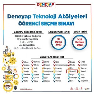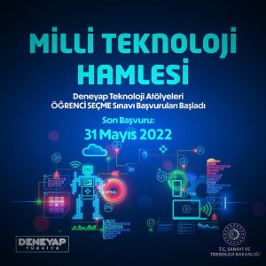 Ülkemizin kalkınması için olmazsa olmaz gördüğümüz “Milli Teknoloji Hamlesi”nin itici gücünü oluşturacak, teknoloji üretme yetkinliği yüksek genç bireyler yetiştirmeyi hedefleyen Deneyap Teknoloji Atölyeleri’ne 2021-2022 eğitim ve öğretim yılı ortaokul seviyesi için; 4. ve 5. sınıflar Lise seviyesi için 8. 9. ve lise hazırlık sınıflarında öğrenim gören öğrenciler başvuru yapabileceklerdir. Başvuru yapan öğrenciler e-sınav ve uygulama sınavı olmak üzere iki aşamayı başarıyla tamamladıktan sonra Deneyap Teknoloji Atölyelerinde eğitim almaya hak kazanabileceklerdir. Başvurmak isteyen adayların elektronik ortamda yapılacak olan e-sınava ön başvurularını 31 Mayıs 2022 saat 23.59’a kadar tamamlamaları beklenmektedir.