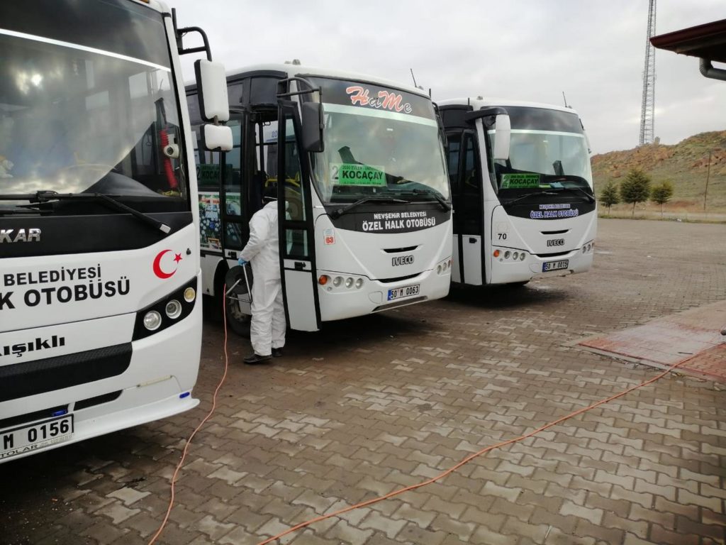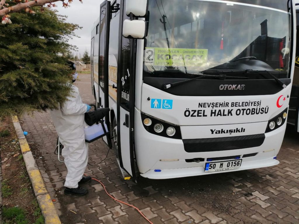 Bu kapsamda kamu kurumlarından açık alanlara, bankalardan sağlık kuruluşlarına kadar her bir bölgeyi titizlikle dezenfekte eden Nevşehir Belediyesi Temizlik İşleri Müdürlüğü ekipleri, otobüs durakları, toplu taşıma araçları ve yeraltı ve yerüstü çöp konteynerlerini periyodik olarak ilaçlıyor.