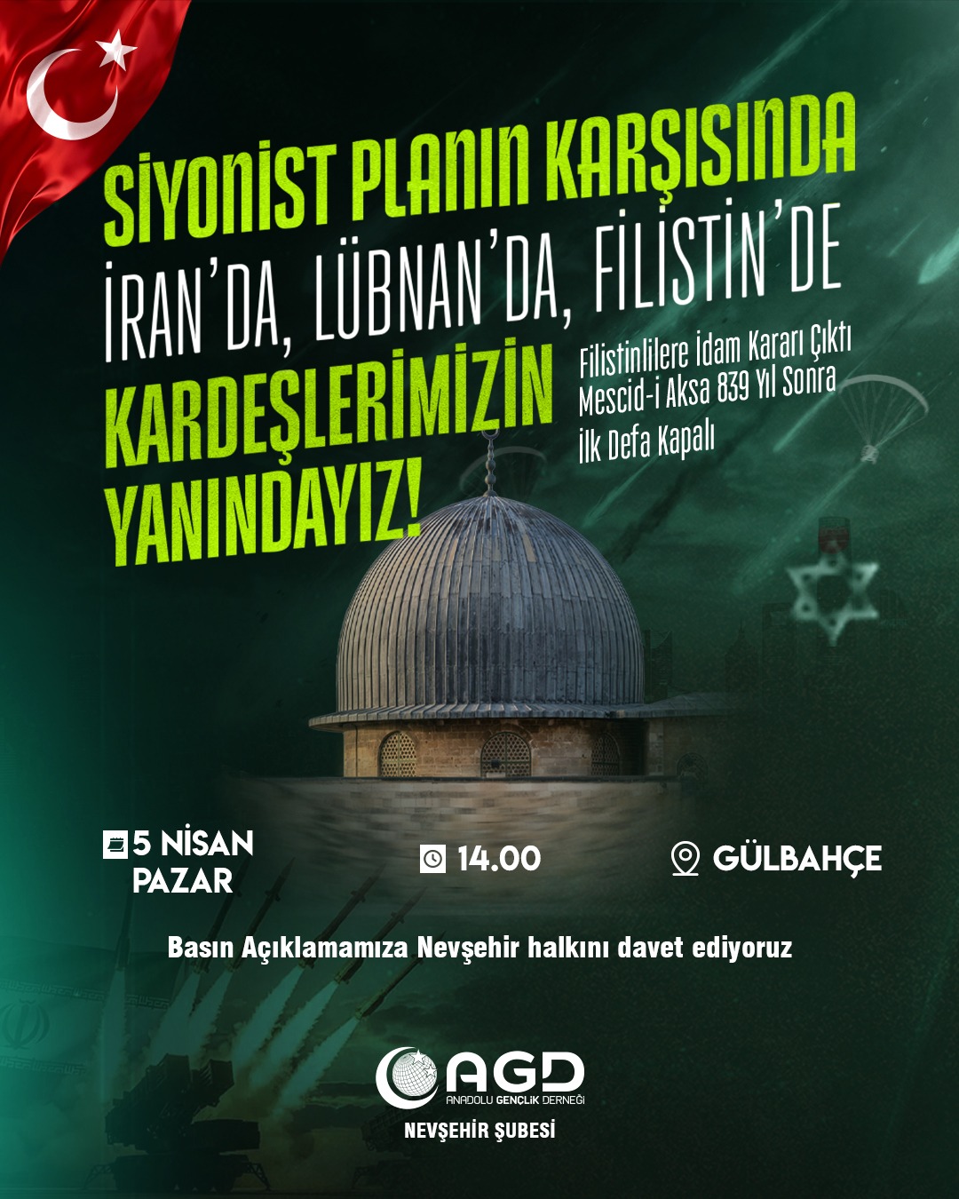 AGD Nevşehir Şubesi, düzenlenecek programla birlikte vatandaşların Filistin, İran ve Lübnan’daki gelişmelere dikkat çekmek amacıyla bir araya geleceğini duyurdu.